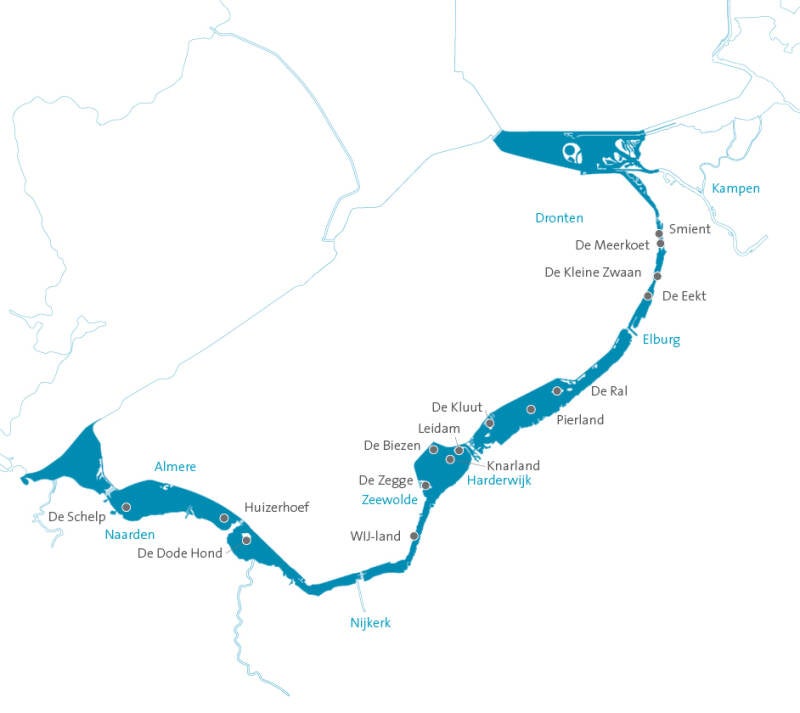 - Gooimeer,Eemmeer,Nijkerkernauw,Nuldernauw,Wolderwijd,Veluwemeer,Drontermeer, Vossenmeer en het Ketelmeer